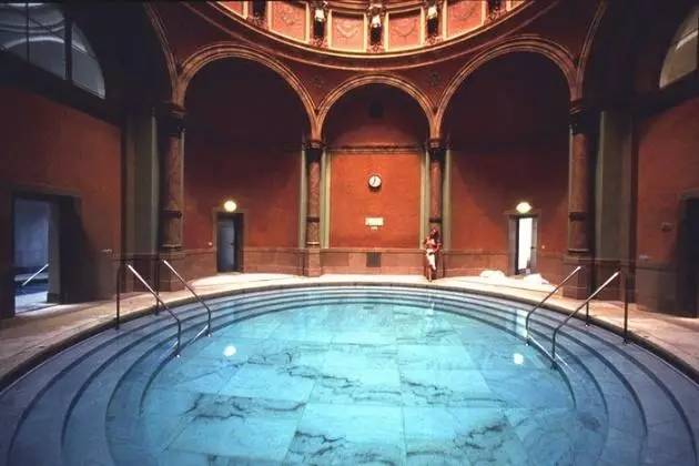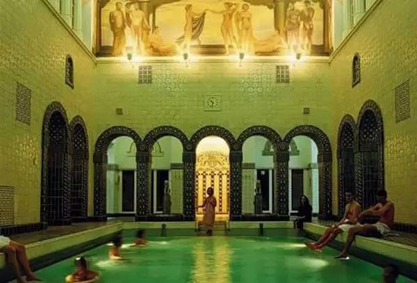 腓特烈浴池是在2000多年前留下的罗马浴池遗迹基础上修建的,大概有200多年的历史。这里每逢周三和周日是男女混浴的,其他时间分浴 (但也有两个可以男女混浴的公共水池,愿意的可以到那里去) 。浴池历史悠久,墙壁和穹顶上画着有点中国风的风景画。