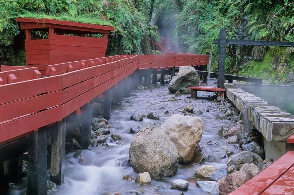 英里的原始森林中,有一条天然温泉小溪,流过山涧。人们在这条烟雾缭绕,仙气十足的美丽山谷中用石材造了17个大小不一的温泉池,一条蜿蜒的木桥串联起所有的池塘,让人们可以闲庭信步的欣赏山谷野趣风景,同时选择自己想要泡的开敞温泉池或者比较隐蔽的温泉池。