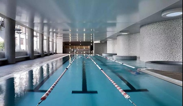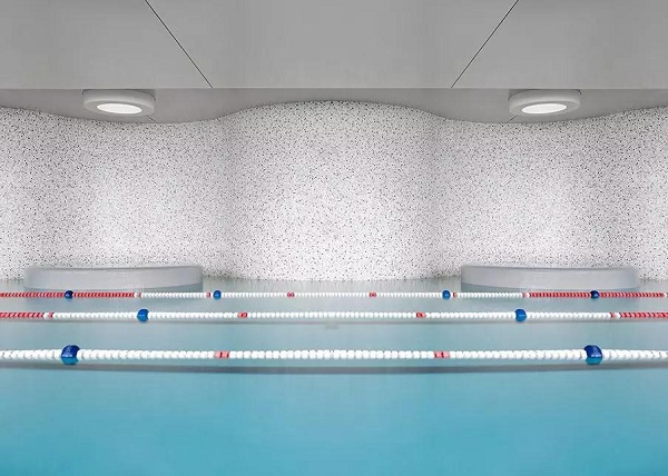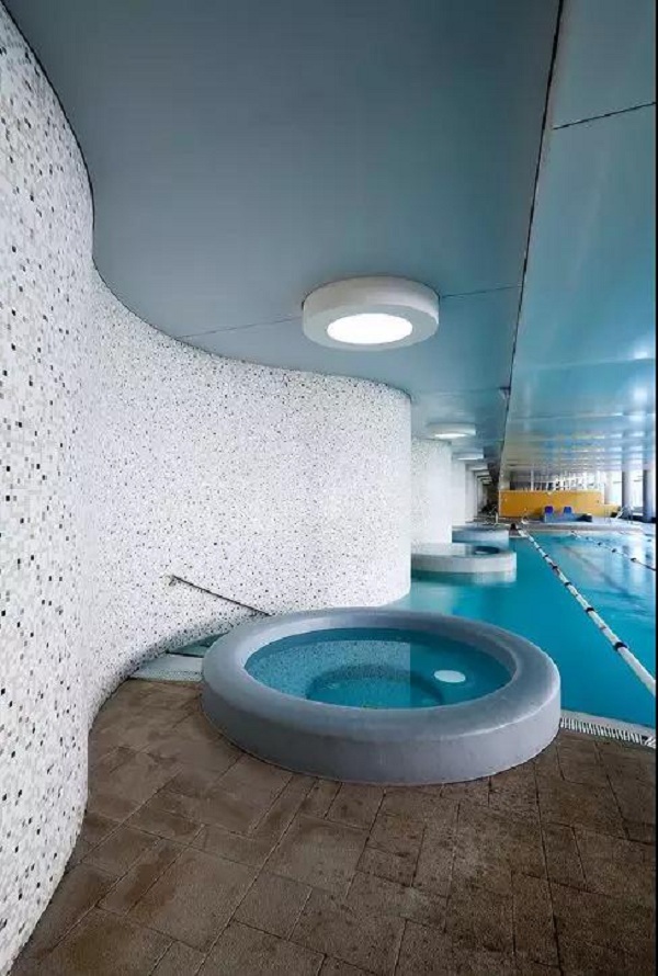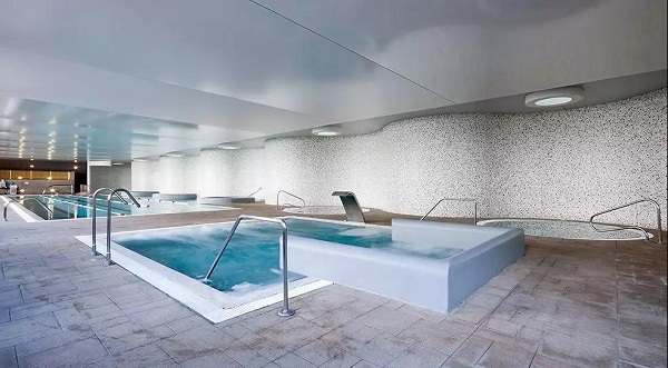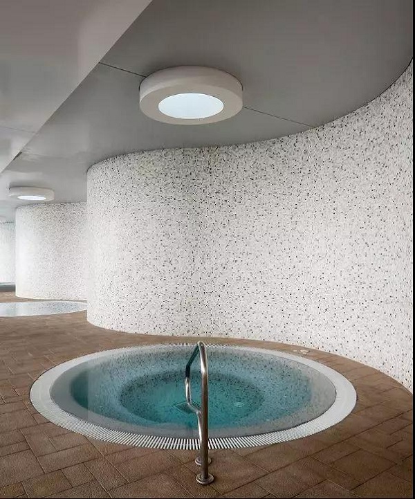 水疗中心包含泳池,水疗池、旋涡池以及重力池等设备,并通过cenital灯照亮不同的区域。