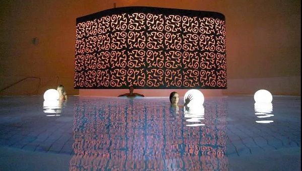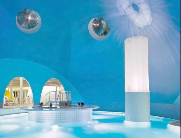 半透明的圆顶从温泉大厅发出红色和蓝色。内置灯与蓝色和红色瓷砖盆相结合,增加了触觉、光学热量和冷感。