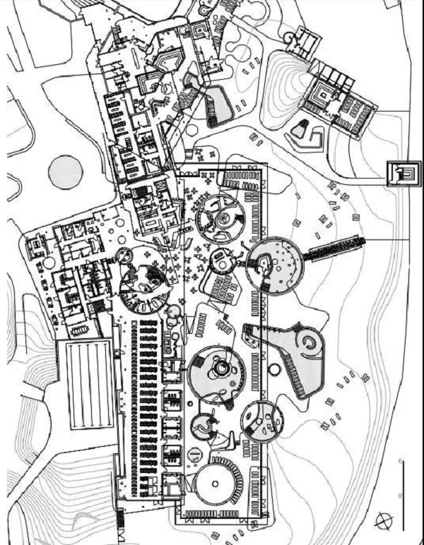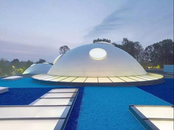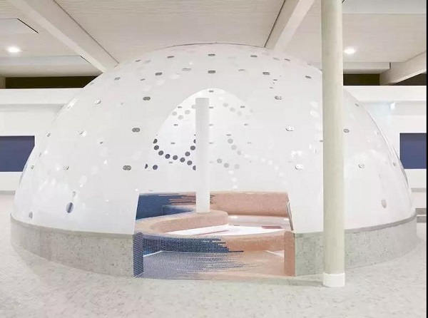圆顶大部分不透明,由各种圆形开口穿孔。每个圆顶都具有明显的个性特征,融合自然光和人工照明,使用不同的材料和颜色,不同的水功能和声学品质。
