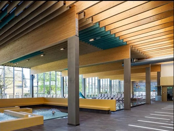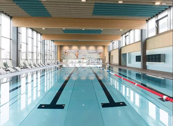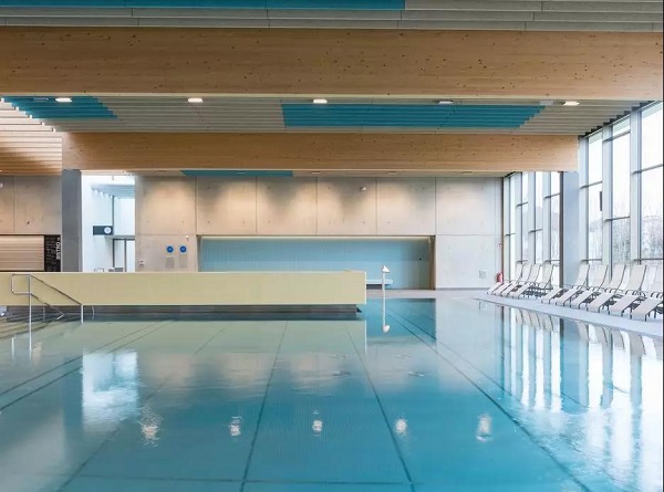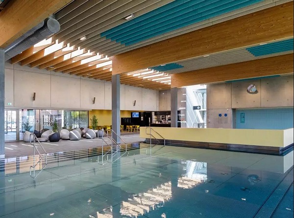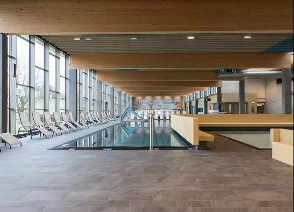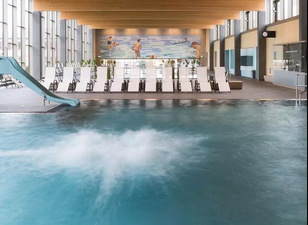 室内还设置提供一个25m长的游泳池,有四个泳道,非常适合进行单圈比赛;一个带按摩喷嘴的家庭休闲水疗池,射流淋浴和气泡座椅,最后是一个带许多娱乐景点的儿童游泳池。