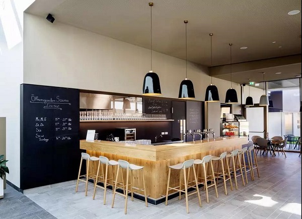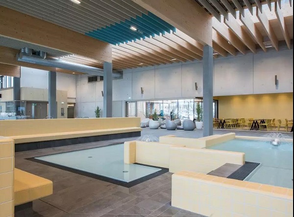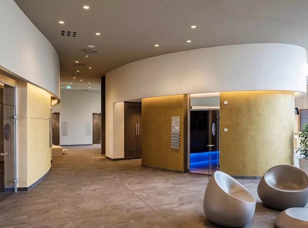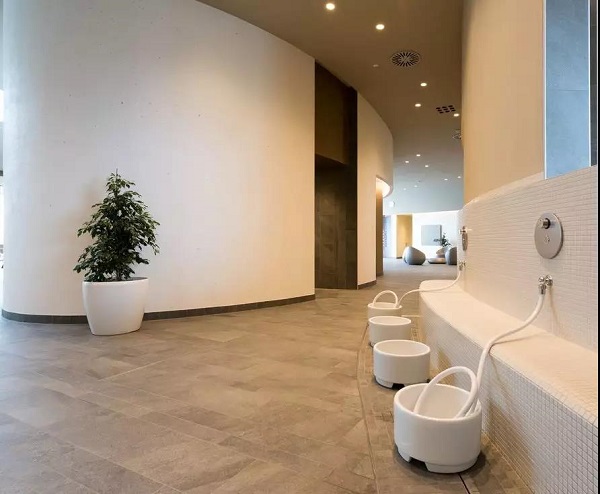 水疗或桑拿设施的游客可通过入口通道,从门厅通向接待处,直达等候区。进入更衣室之后,桑拿浴室和水疗成为不同的部分,前厨房位于桑拿浴室和游泳区之间,为小餐馆和桑拿吧提供各种饮品和餐点。