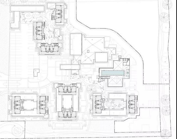 为了确保酒店和水疗中心的视野与迷人的小镇风情融为一体,设计方法着重于在不超过两层的建筑范围内缩小项目规模。建筑物的设计采用平屋顶,以最大程度地减少对周围山丘的阻挡,并通过院子精心地连接起来,每个院子都有自己独特的设计理念。