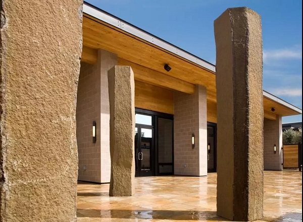 可重复使用的材料遍布酒店各处,包括外墙护壁和酒店内部其他区域上的打捞木材。回收的钢材还以生锈的钢板形式用于建筑立面上,其设计旨在代表葡萄酒,周围的葡萄园以及用于维护它们的设备中发现的颜色。