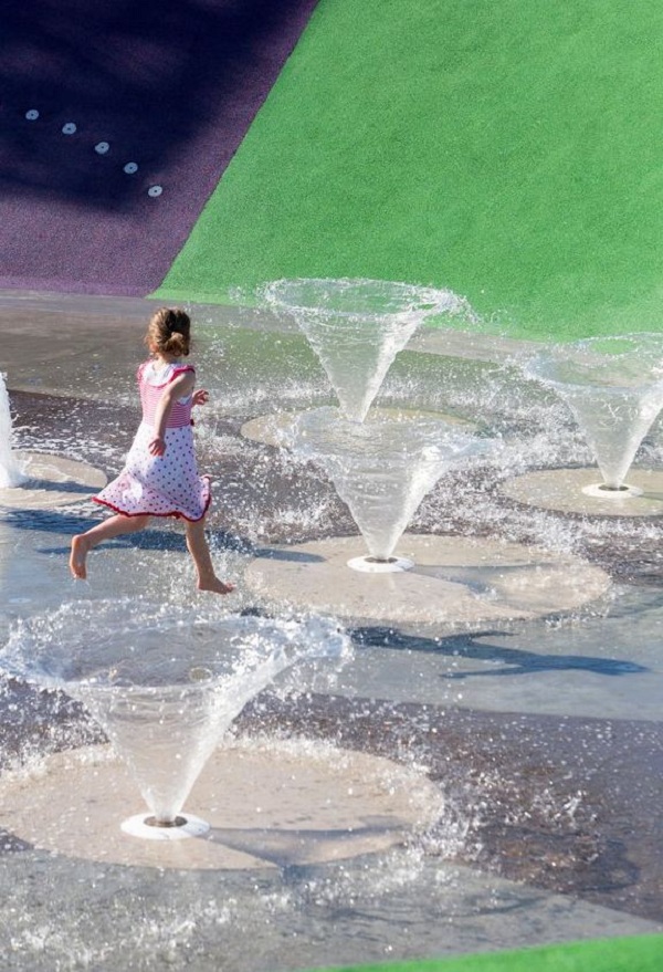 水广场喷头可提供多种可编程的水效果,以适应参观方式和季节。大型而强大的单喷流与精细的定向喷流和低熔岩喷流相结合,形成了使空间充满活力和细分的线,圆和弧。