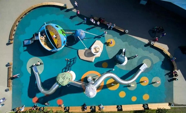 两架太空火箭通过钢网隧道连接。跳上太空飞船,探索宇宙的行星。火箭对面是对地球的抽象解释。该设计是一种复杂的结构,需要将滑梯和可攀爬的绳索悬挂在地面上才能攀爬。