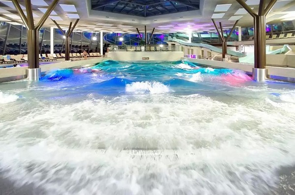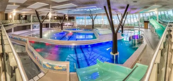 室内水世界设有3个主泳池。在波浪池中,您可以享受海浪。休闲泳池提供各种按摩喷头。漩涡浴缸配有水按摩床。除了这些游泳池外,还有5岁以下儿童的儿童游泳池。所有游泳池均采用最优质的不锈钢制成。
