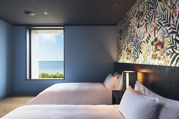 下沉式设计的客厅是其具有的特色,客厅、用餐区、卧室各自独立,宽敞的空间适合长期留宿。专门邀请了琉球红型印染的匠人制作了卧室中的壁纸,向宾客诉说着冲绳的文化。若您仔细观察壁纸,能够在其中发现冲绳的人们被各种冲绳植物所围绕的生活场景。