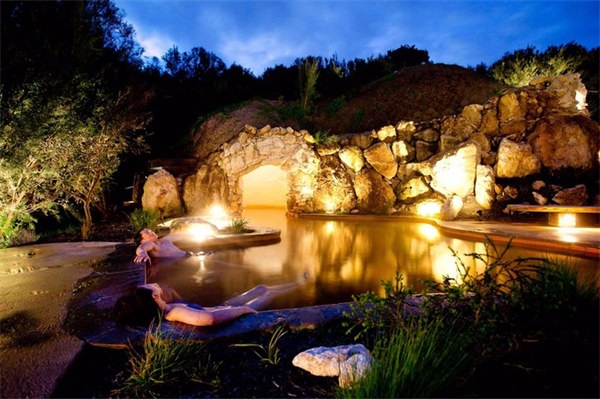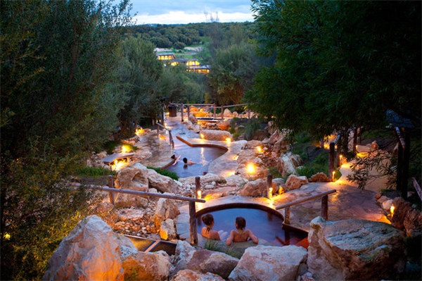 像洞穴池、浴谷、岩洞、按摩池、湖边池、桑拿池、热浴按摩、家庭洗浴区、冷水池和土耳其风格的沐浴室等,都隐匿在那山坡、丛林之中。除了这些室内温泉池规划设计之外,还有位于山坡之上的温泉池Hilltop Pool,更震撼人心。
