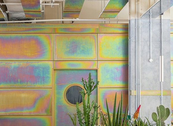 空间叙事以捕捉约书亚树公园的迷幻体验为依据。吧台桌面、墙板以及带有凹槽的偏光玻璃滑动隔断均采用了镀锌钝化的工艺,从而呈现出彩虹般的视觉效果。这种浸渍工艺能够在金属表面形成一层氧化物般的光泽,从而将沙漠天空之美嵌入酒店的基因。