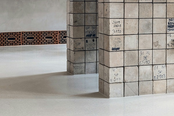 原本将被填埋的混凝土立方体试块被赋予了新的功能,作为六米长的水磨石桌子的基座出现在酒店首层的办公空间;此外还被用于啤酒吧吧台正面的塑造。重复利用的钢筋和黏土砖则与贯穿整个空间的铁艺和木制元素相搭配。