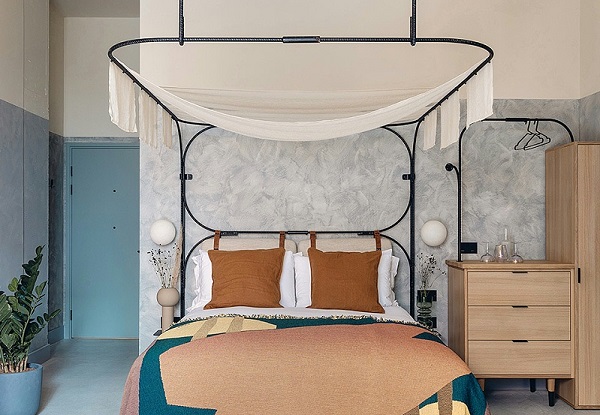 客房客厅被浸染在蓝色、米黄色与灰色调中,工作室还特别设计了数个模块沙发,采用混合的沙子和树脂板以手工制成,再次呈现了沙漠的色调。房间内的定制床架由黑色回收螺纹钢和亚麻布蓬制成,在混凝土丛林中置入了不同以往的庇护感,同时也从美学和生态责任两个方面表达了对自然奇迹的致敬。