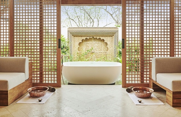 水疗中心受到水、气、土和火四种元素的启发。每一个元素都在水疗室中得以体现:浴缸位于水面如镜的反射池上,水面的四周环绕着火焰,花园中遍布郁郁葱葱的植被,并且还可根据需要选择户外按摩。