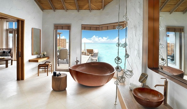 从客人到达酒店的那一刻起,迎面而来的便是融入当代风格的自然元素。碧水沙滩别墅融合了手抹灰泥墙壁、漂白柚木、天然织物和印度洋绿松石的色调。装饰性编织床头板的设计灵感来自当地工艺:从天花板垂坠下来的帷幔,形成一幅美丽的背景,衬托根据岛屿浮木的灵感所打制的雕刻木制家具。一个巨大的铜浴盆在灯下发出熠熠光辉,铜质装饰像珠宝一样点缀着房间。
