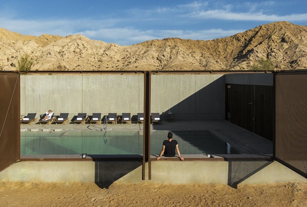 小屋、水疗中心和餐厅建筑被一条贯通的道路隔开,为度假胜地的总体规划创造了一种不寻常且充满活力的都市感。这些建筑与历史悠久的石油泵一起在稀少的沙漠景观中存在着,并将成为了解和发现这种新干预措施的人们的目的地和停靠站。