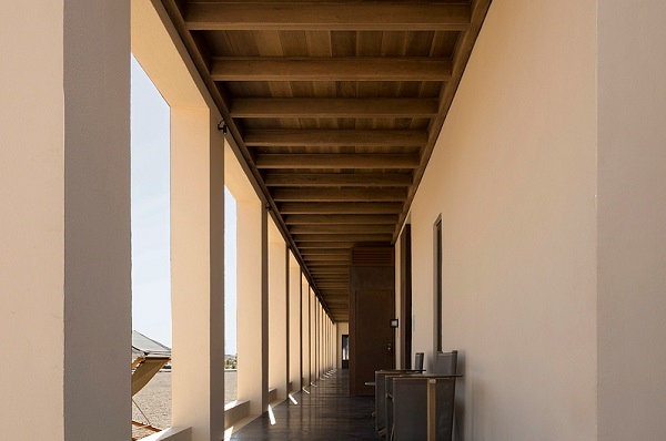由于沙漠条件在夏季呈现出极热且长时间暴露在强烈阳光下的情况,因此在设计建筑物的形式和质量时考虑这些因素非常重要,其次是选择合适且坚固的材料,当地采购的石材或混凝土为建筑提供了大量的热质量来应对极端的温度波动。