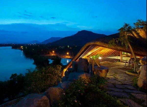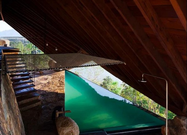 帐篷温泉的建造采用当地的材料,如堆积在现场的干堆石头和椰子叶,以及岩石、钢筋和各种瓷砖,为客人带来和谐而自然的感觉。在帐篷内空间分为两个层次。在上层,一间私人卧室被木框和彩色玻璃覆盖。安装在空隙中间的网子为喜欢在空中玩耍的客人增添了异国情调。下方的空间,一个带有旧式木制家具的不定式矿泉池是帐篷的休闲空间,可俯瞰下面的河流。