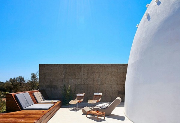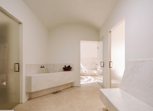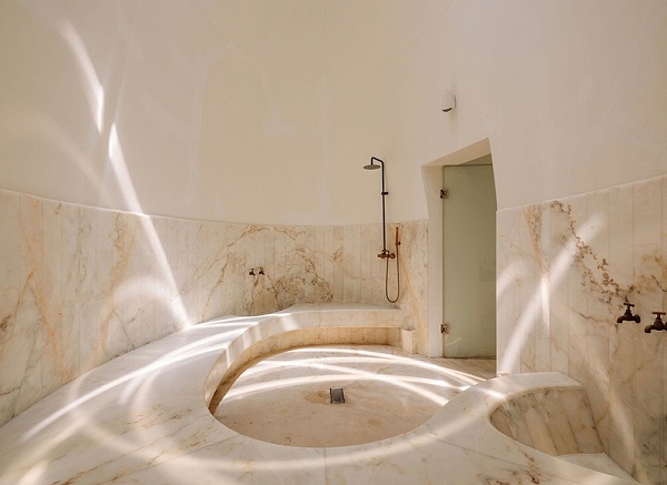 在隔壁温暖的房间里有宽大的大理石长凳,有圆润的边缘,它们轻柔地接触皮肤。在平面上,房间的几何形状呈椭圆形,横截面呈抛物线形。它被故意设计成曲线,圆形平面和截面的结合增强了特定的空间体验。建筑设计的形状增强了体验的感性,里面的灯光提供了一种精神体验,定期滴水的声音丰富了气氛,使气氛变得完全放松。