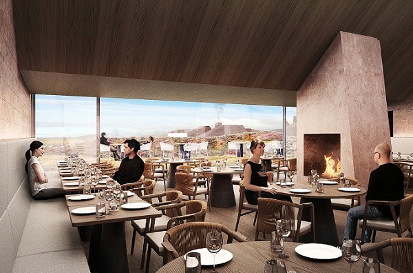 混凝土被选为主要材料,并用红色颜料处理,模仿周围景观的色调。同时被用来创造出对比鲜明的粗糙和光滑纹理层,并形成灵感来自草皮房屋层中的图案。屋顶的选定部分像该地区的传统建筑技术一样被草覆盖,这既强化了与场地历史密切相关的建筑的概念,又增加了从景观中谨慎升起的隐藏目的地的感觉。在建筑物的外部使用反射玻璃产生镜面效果,唤起建筑物消失在景观中的错觉。门户和隧道还分散在整个建筑中,以增强这种超凡脱俗和神奇的氛围。