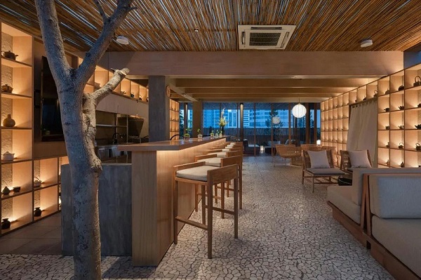 当客人们接近屋顶酒吧时,竹子元素再次出现。这次它被用来覆盖整个天花板,投射出令人愉悦的舞蹈光影效果,白色大理石马赛克地板灵感源自破碎的陶瓷。