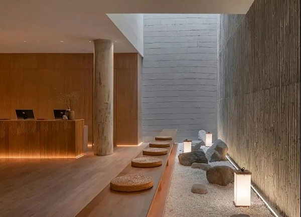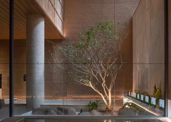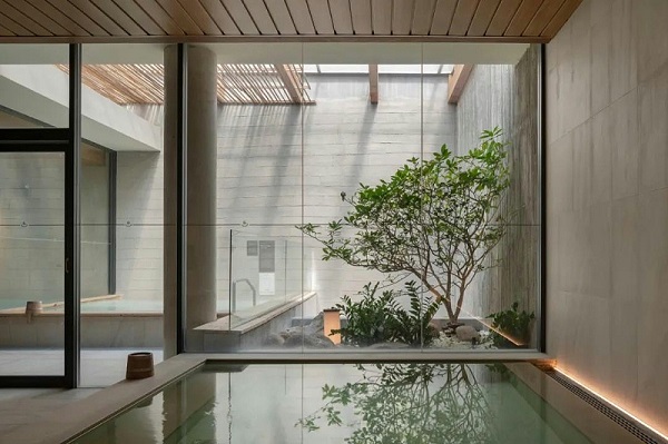 木质贴面地板和隐藏的灯光为走廊营造了平和与放松的氛围。设计师有意将大厅放置在郁郁葱葱的花园庭院旁边,为客人带来一些惊喜。庭院还充当着两栋建筑之间的缓冲区,是温泉和按摩设施的公共空间。