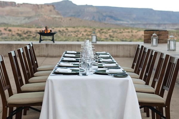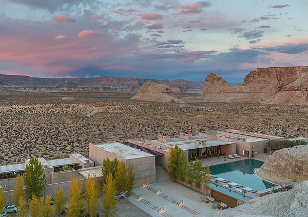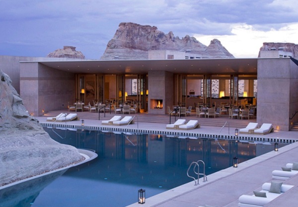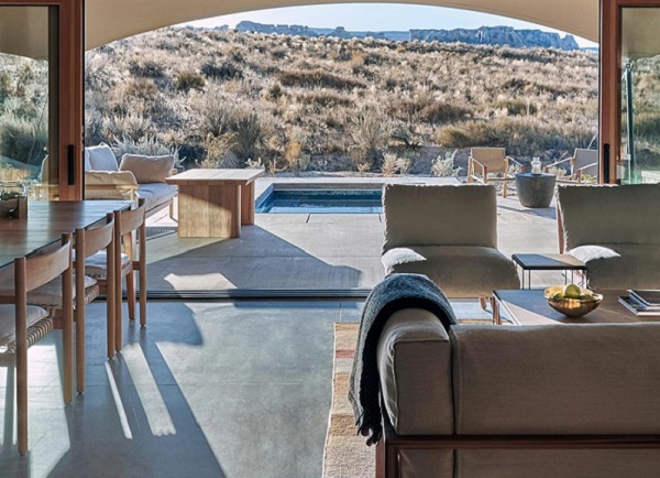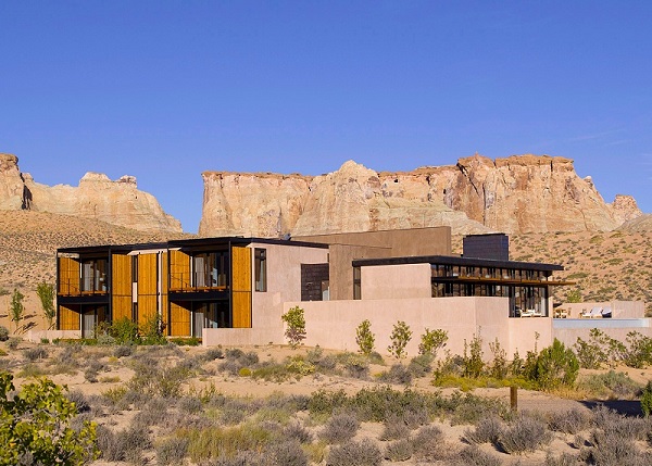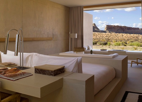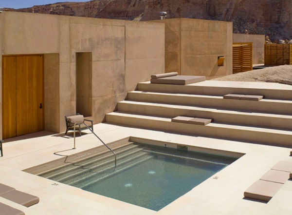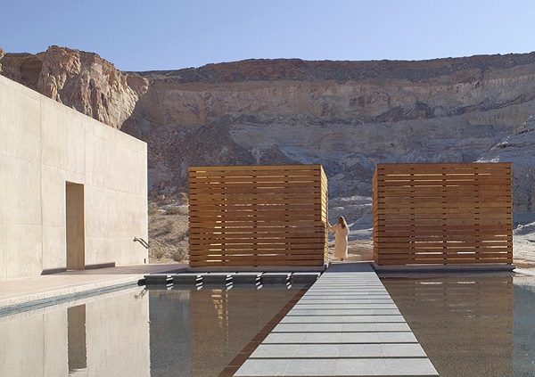洗浴中心配套的客房线条简洁,空间宽敞,采用天然材料进行装饰,与周围犹他州无垠荒漠的明亮色质完美契合。设计上采用白石地板、水泥墙壁、天然原木和深色金属设施。每间客房均配备一个带有壁炉的户外休闲室,举目可见大漠孤烟写意洒脱,部分还配有私人泳池或屋顶露台。