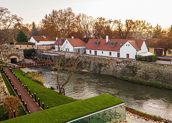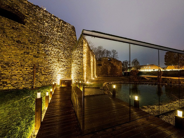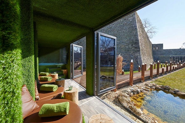 设计师受到当代洗浴设计理念的启发,对无法再发挥作用的遗产地进行了重新利用,在古老的护城河内创造了一个“伪装的”洗浴水疗空间。相比于酒店内部所营造的巴洛克式的高贵感,旅馆 旁边的spa中心呈现出更具现代气息的独享态度。该项目营造了一种独特的感觉,既反映出其所在场地的传统,又在一个开放的、公众可见的空间里构建了一种与世隔绝的舒适体验。