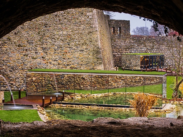 洗浴水疗中心在曾经作为护城河的区域内嵌入了两座长方形的体量,其外墙覆盖着镜面,与古老的城堡相望。体量中容纳着休闲空间,同时又遮挡住了从桥上经过的游客的实现。巧妙设置的反光窗面让客人们可以在花园的围绕下享受片刻的放松,同时又不至于被建筑外面的游客打扰,他们只能从镜面上看到城堡石墙的倒影。