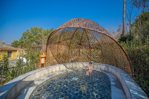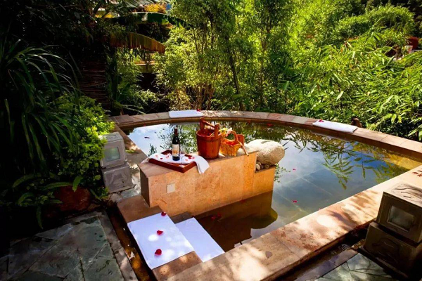 在温泉规划设计中,也可以利用人工造景,将具备私密性的溶洞、树洞、石屋、木屋、树屋、岩壁洞沽;大型工艺藤编、竹编、陶艺、塑石、塑木工艺;半封闭的亭、廊、阁等人工造景,配合温泉池,以达到私密效果。